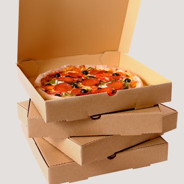 Food grade E-flute corrugated pizza boxes in brown and white kraft paper.